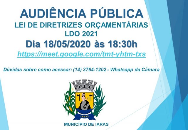 Sendo assim, o Legislativo de Iaras realizará a primeira audiência pública virtual para discutir a Lei de Diretrizes Orçamentárias de 2021 (LDO). Será na próxima segunda-feira, dia 18, a partir das 18h30, sem a presença de público. “Mas todos poderão acompanhar pela plataforma digital Google Meet que pode ser acessada por qualquer pessoa, seja por celular ou computador acessando o link https://meet.google.com/tmt-yhtm-txs”, destaca a vereadora Tita.