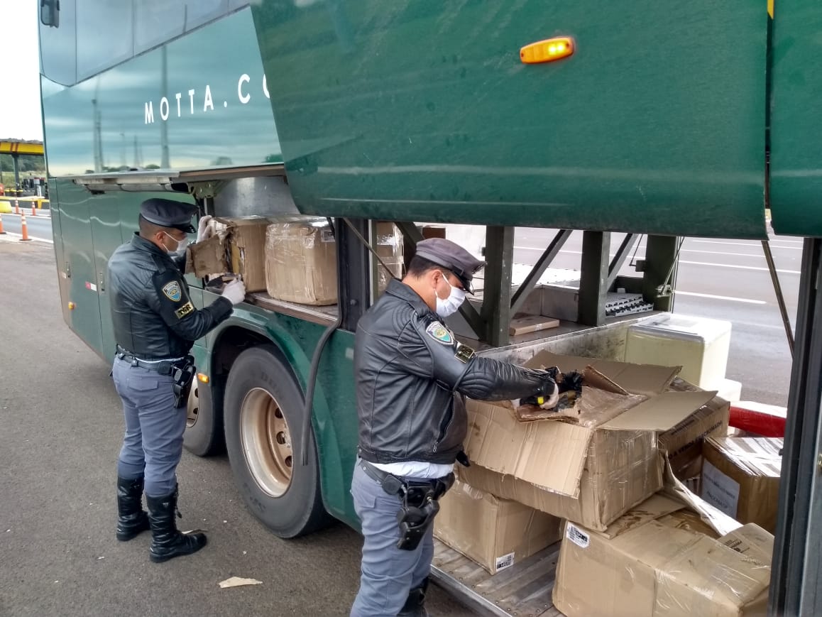 Os policiais militares verificaram os documentos de transporte referente as caixas, que ficam de posse do motorista, e notaram que não havia nota fiscal sobre a carga, e sim uma declaração de conteúdo e responsabilidade que estava anexo ao documento de transporte da empresa de ônibus. Também os nomes constantes como remetentes e destinatários na documentação não condiziam com nenhum dos passageiros do coletivo.