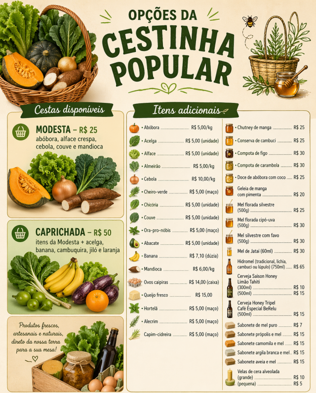 Nesta edição, estão disponíveis duas opções de cestas. A “Modesta” reúne itens básicos e a “Caprichada” amplia a variedade com mais produtos. Segundo a organização, os alimentos são colhidos próximos à data de entrega, garantindo qualidade e frescor.