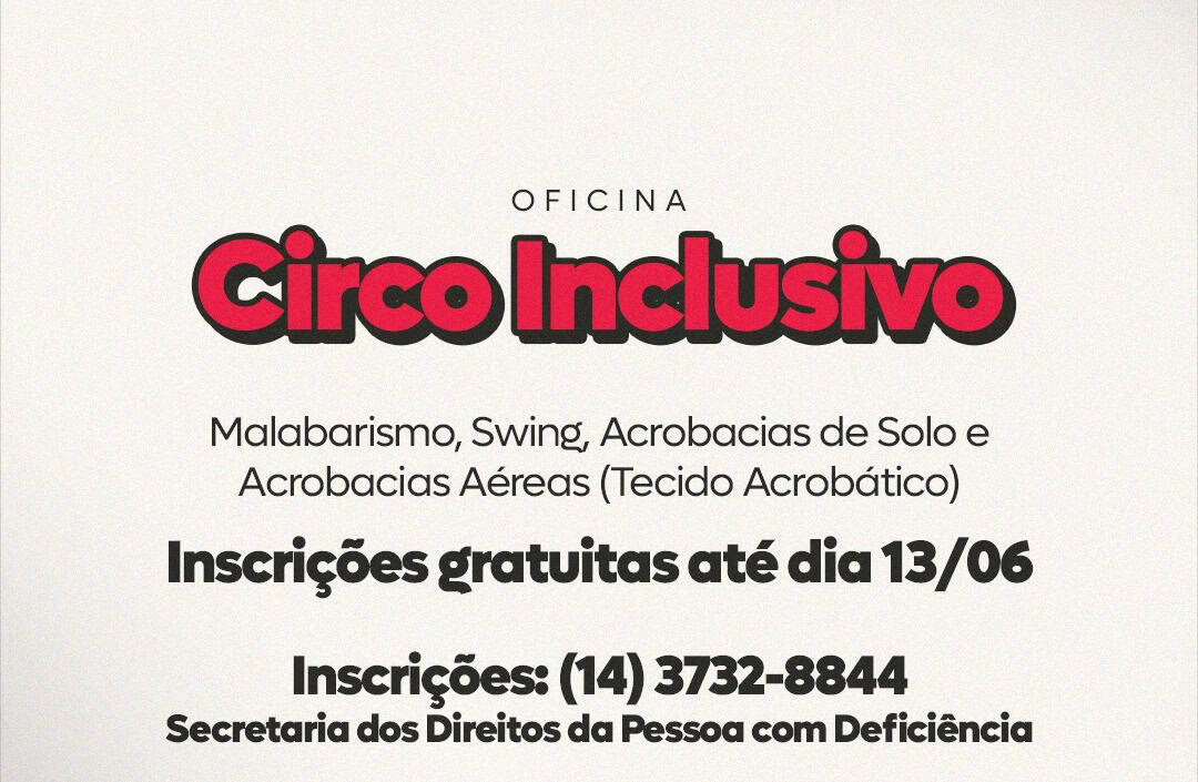 A oficina irá acontecer no sábado, dia 15/06, das 16h às 18h na Estação das Artes. Para participar, os interessados devem entrar em contato com a Secretaria dos Direitos da Pessoa com Deficiência. As inscrições são gratuitas e vão até o dia 13/06 por ordem de inscrição até que as vagas sejam preenchidas.