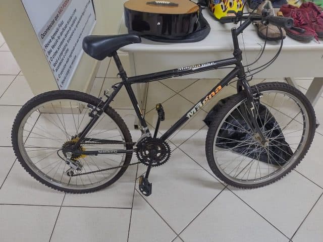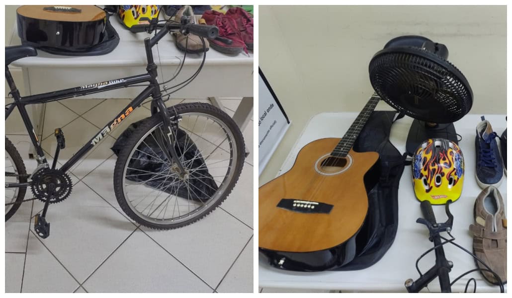 Ainda no local a equipe ouviu um barulho na esquina próxima e, iniciou diligência a fim de localizar o autor, momento em que visualizou e deteve o homem de 35 anos, o qual apresentava algumas escoriações no rosto; ele estava em posse de uma bicicleta preta e um violão que foram furtados de outra casa da mesma rua, onde a janela do quarto de um depósito foi quebrada e, no telhado do imóvel, foi localizado um saco plástico contendo um ventilador, um capacete ciclístico, dois pares de tênis, um pé de sapatênis, um par de chinelos e um pé de outro chinelo, também subtraídos do local.