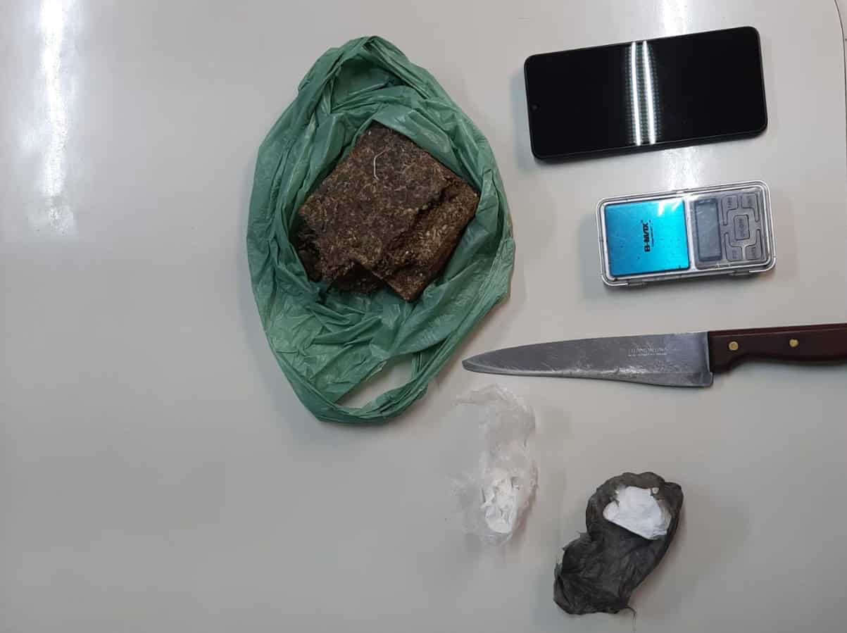 No primeiro endereço, situado no Jardim Bela Vista, a diligência transcorreu sem incidentes e nenhum ilícito foi encontrado. Já na segunda residência, localizada no Jardim da Serra, onde o próprio investigado alegou ir diariamente para cuidar de um cachorro, os agentes localizaram um tijolo de maconha (298,5g), duas porções de cocaína (26,2g), uma faca com resquícios de droga, uma balança digital e outro aparelho celular.