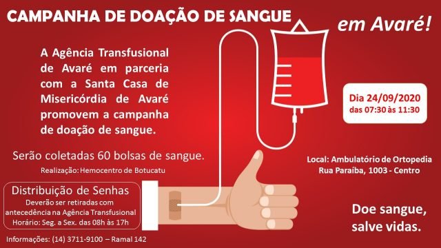 Serão coletadas cerca de 60 bolsas de sangue no período das 7h30 às 11h30, com distribuição de senhas antecipadas que podem ser retiradas na Agência Transfusional de Avaré, bastando agendar pelo telefone (14) 3711-9100 – Ramal 142.