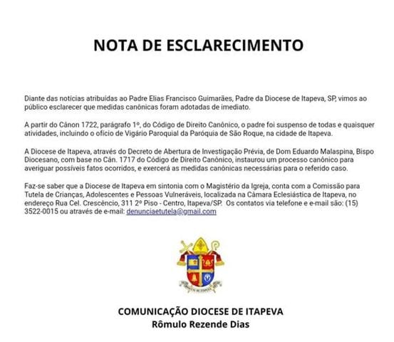 O afastamento foi divulgado no último sábado (17), através das redes sociais da diocese. Elias Francisco Guimarães, de 63 anos, atuava na Paróquia São Roque, há aproximadamente seis meses.