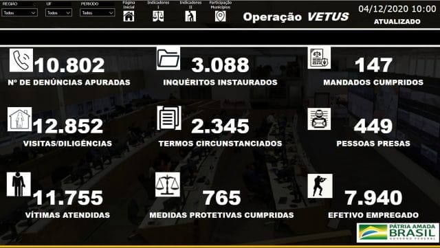 Segundo dados do MJSP, até o dia 02/12/20, 6.814 denúncias foram apuradas em todo o país, com a instauração de 2.201 inquéritos policiais e 1544 termos circunstanciados, 82 mandados cumpridos, 8.509 diligências realizadas, 715 pessoas presas, 8.612 vítimas atendidas e 461 medidas protetivas cumpridas.