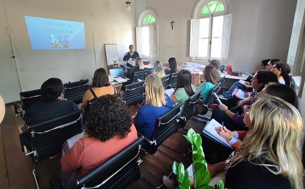 Professores que integram o reforço escolar participaram de uma formação na quarta-feira, 3 de julho, sobre o método fônico das onomatopeias, técnica pedagógica que visa aprimorar o processo de alfabetização e desenvolvimento da linguagem das crianças.