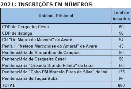 Os presídios subordinados à Coordenadoria da Região Noroeste (CRN) inscreveram 3.299 reeducandos na 16ª Olimpíada Brasileira de Matemática das Escolas Públicas (Obmep). A maior competição científica do país passou por mudanças em razão da pandemia de Covid-19 e a edição, que seria realizada em 2020, foi transferida para este ano. Em Avaré e região, 680 presos de nove unidades foram inscritos para participar do exame (veja quadro abaixo).