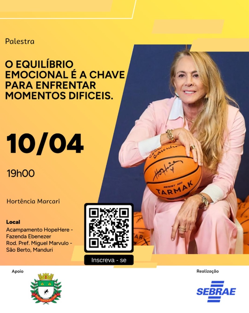 O Sebrae-SP, em parceria com a Prefeitura de Manduri, promovem no dia 10 de abril, às 19 horas, uma palestra motivacional com a ex-jogadora de basquete Hortência Marcari. O evento, que tem como tema o equilíbrio emocional, é gratuito e ocorrerá no Acampamento Hope Here – Fazenda Ebenezer, localizado na Estrada do Palmital, s/n, Distrito de São Berto, em Manduri/SP. A participação é totalmente gratuita, com vagas limitadas.