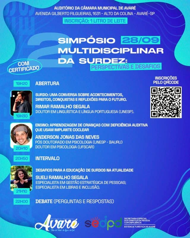 PALESTRANTES – A edição vai contar com a participação de especialistas que são referência na área. Doutorando em Linguística e Língua Portuguesa pela UNESP, o professor Rimar Ramalho Segala vai falar sobre o tema “Surdo: Uma Conversa Sobre Acontecimentos, Direitos, Conquistas e Reflexões Para o Futuro”.