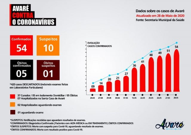 Os dados atualizados sobre a pandemia do coronavírus em Avaré mostram que a cidade contabiliza 54 casos confirmados, com cinco pacientes em isolamento domiciliar, 37 curados, cinco óbitos, sete internados na Santa Casa de Avaré.