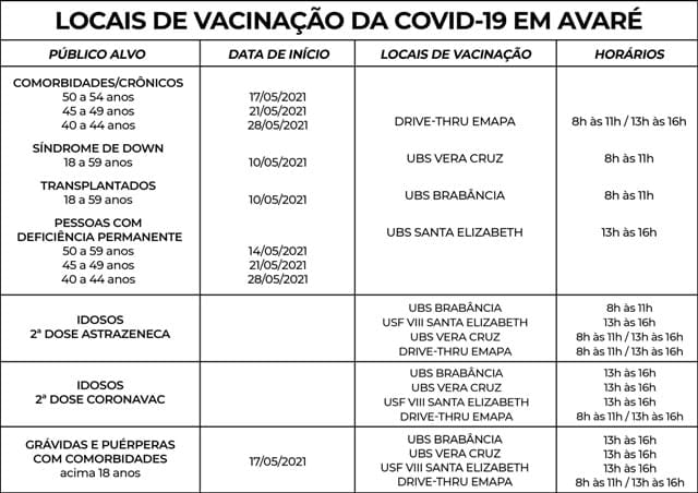 - Posto Jardim Vera Cruz (Rua Carmem Dias Faria, s/n) das 8 às 11 e das 13 às 16 horas;